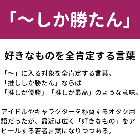 アイドルやキャラクターを称賛するオタク用語だったが、最近は広く「好きなもの」をアピールする若者言葉になりつつある。