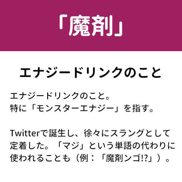 エナジードリンクのこと。特に「モンスターエナジー」を指す場合が多い。Twitterで誕生し、徐々にスラングとして定着した。「マジ」という単語の代わりに使われることも(例:「魔剤ンゴ!?」)。