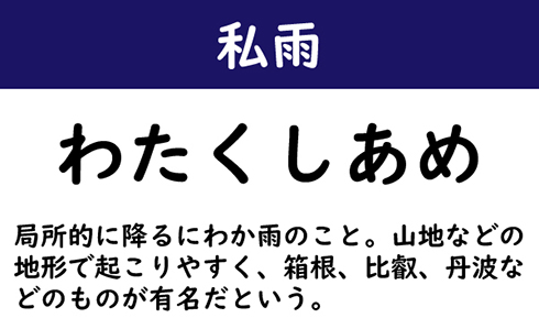 局所的に降るにわか雨のこと。山地などの地形で起こりやすく、箱根、比叡、丹波などのものが有名だという。