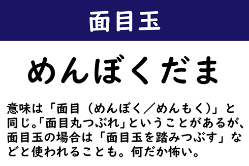 意味は「面目(めんぼく/めんもく)」と同じ。「面目丸つぶれ」ということがあるが、面目玉の場合は「面目玉を踏みつぶす」などと使われることも。何だか怖い。