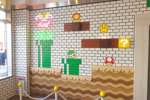 ということで、次はカフェの店内に入れてもらいました。店の中は壁もテーブルもマリオづくし。壁にはブロックやパックンフラワーのネオンが配され、入場整理のポールの先端までマリオ仕様。凝ってるな!
