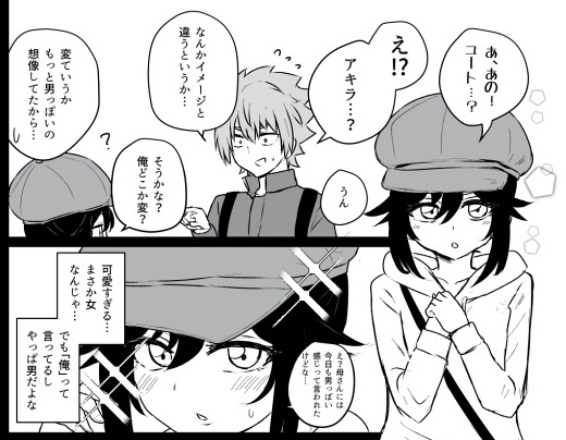 当のアキラは「初めて男の人(異性)と手を繋いでしまった」とドキドキしており、実は女の子だったのでした! ゲームだとユートの方が弱いくせに、会ってみたらちゃんとエスコートしてくれるしっかりした男の子だったのが意外だったみたいです。
