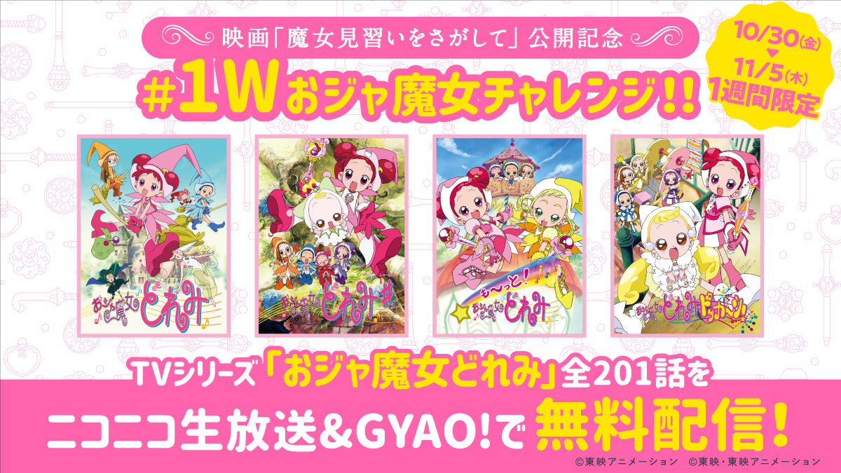 映画「魔女見習いをさがして」の公開を記念して、10月30日から11月5日までの1週間、GYAO!とニコニコ生放送で「おジャ魔女どれみ」シリーズの全話無料配信企画「#1Wおジャ魔女チャレンジ」が実施されます。君は4シリーズ全201話を1週間で制覇できるか……?