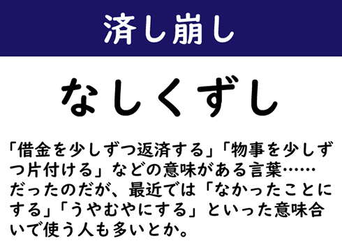 「借金を少しずつ返済する」「物事を少しずつ片付ける」などの意味がある言葉……だったのだが、最近では「なかったことにする」「うやむやにする」といった意味合いで使う人も多いとか。