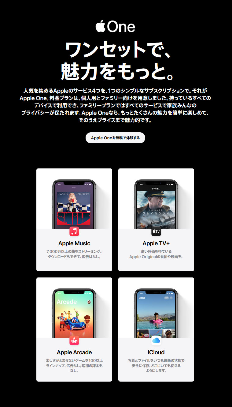 Appleのサブスクリプションサービス「Apple One」が、10月31日より日本でも正式スタートしました。「Apple Music(音楽)」「Apple TV+(動画)」「Apple Arcade(ゲーム)」「iCloud(クラウドストレージ)」の4つのサービスをまとめたもので、価格は個人プランが月額1100円。また最初の1カ月間は無料で利用可能となっています。