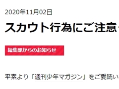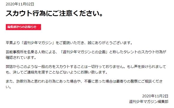 週刊少年マガジン編集部は、「週刊少年マガジンの企画」と称した虚偽のタレントスカウト行為が確認できたとして、注意を呼びかけています。