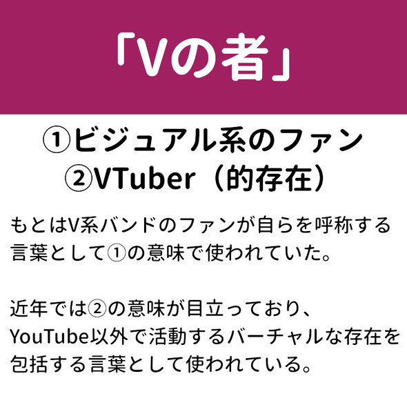 もとはV系バンドのファンが自分たちを呼称する言葉として「†Vの者†」のように(1)の意味で使われていた。