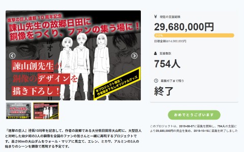 設置費用はクラウドファンディングで募り、目標(1400万円)の200%を超える資金を集めました。ネクストゴールの2500万円もクリアしたため、日田駅前の広場にリヴァイ兵長の銅像を設置することも決定しています。