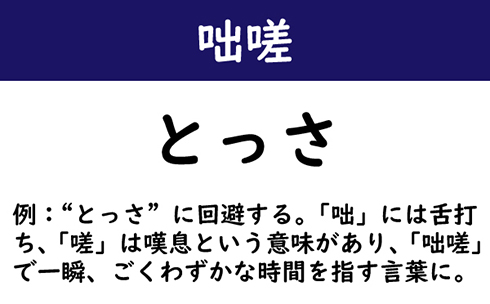 例:“とっさ”に回避する。「咄」には舌打ち、「嗟」は嘆息という意味があり、「咄嗟」で一瞬、ごくわずかな時間を指す言葉に。