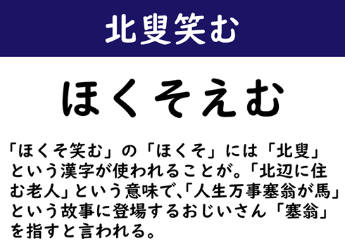 「ほくそ笑む」の「ほくそ」には「北叟」という漢字が使われることが。「北辺に住む老人」という意味で、「人生万事塞翁が馬」という故事に登場するおじいさん「塞翁」を指すと言われる。