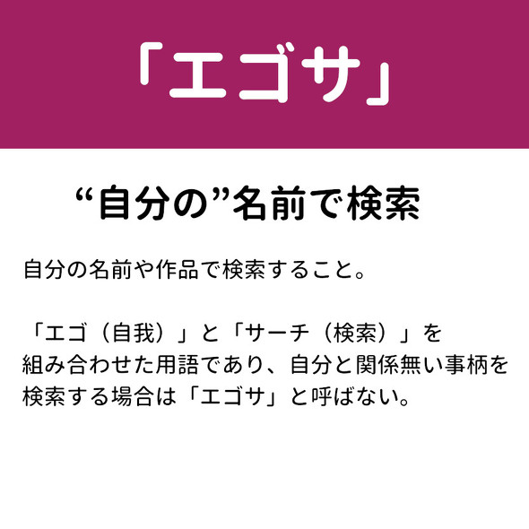 自分の名前や作品で検索すること。自我を表す「エゴ」と「サーチ」を組み合わせた用語であり、自分と関係の無い事柄を検索する場合は「エゴサ」と呼ばない。