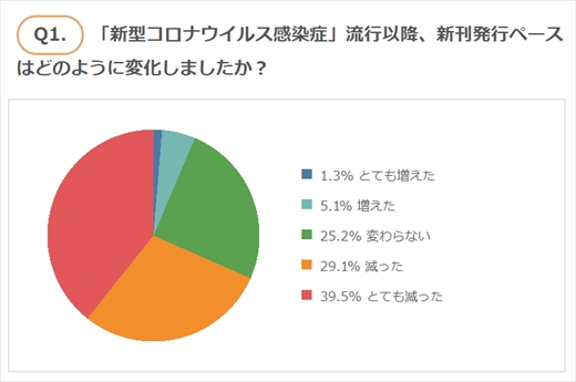 COVID-19(新型コロナウイルス感染症)流行後の新刊の発行ペースについては、39.5%が「とても減った」、29.1%が「減った」と回答。変わらないという回答は25.2%で、少数ですが「増えた(5.1%)」「とても増えた(1.3%)」人もみられました。