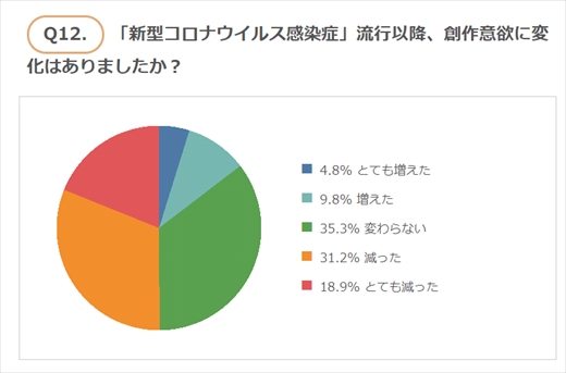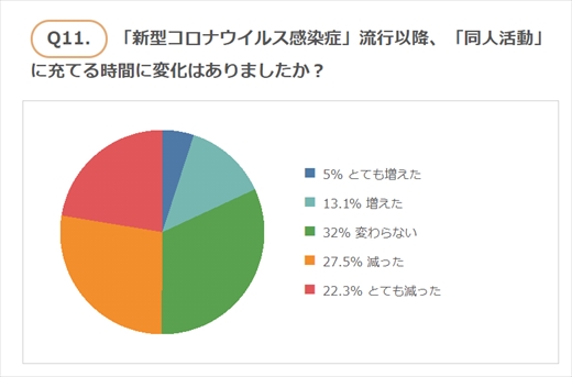 同人活動にあてる時間についても、「とても減った(22.3%)」「減った(27.5%)」とおよそ半数が減少。創作意欲についても「とても減った(19.8%)」「減った(31.2%)」と約半数が意欲の減退を感じているという結果に。