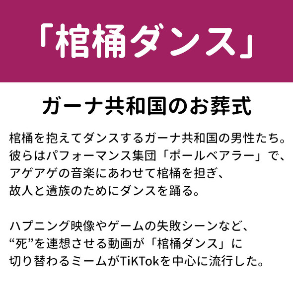 ハプニング映像やゲームの失敗シーンなど、“死”を連想させる動画が「棺桶ダンス」に突然切り替わるネットミームがTiKTokを中心に流行した。