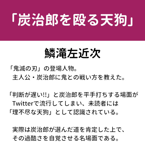 「判断が遅い!!」と炭治郎を平手打ちで叱咤する場面だけがTwitterで流行してしまい、未読者には「炭治郎を理不尽に殴る謎の天狗」として認識されている。実際は炭治郎が選んだ道を肯定した上で、その過酷さを自覚させる名場面である。