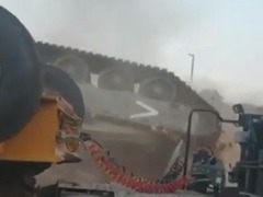 映像を確認すると、戦車はキャリア後部からゆっくりと前進して、積載作業を進めていきます。ここまでは特に問題なかったのですが、さらに戦車を前進させようとしたところ、加速が止まらずにキャリアの前部に乗り上げてしまい、勢いそのままキャリアから転がり落ちてしまいました。