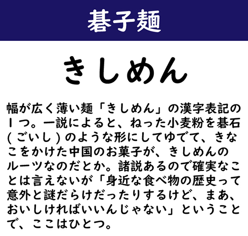 幅が広く薄い麺「きしめん」の漢字表記の1つ。一説によると、ねった小麦粉を碁石(ごいし)のような形にしてゆでて、きなこをかけた中国のお菓子が、きしめんのルーツなのだとか。諸説あるので確実なことは言えないが「身近な食べ物の歴史って意外と謎だらけだったりするけど、まあ、おいしければいいんじゃない」ということで、ここはひとつ。