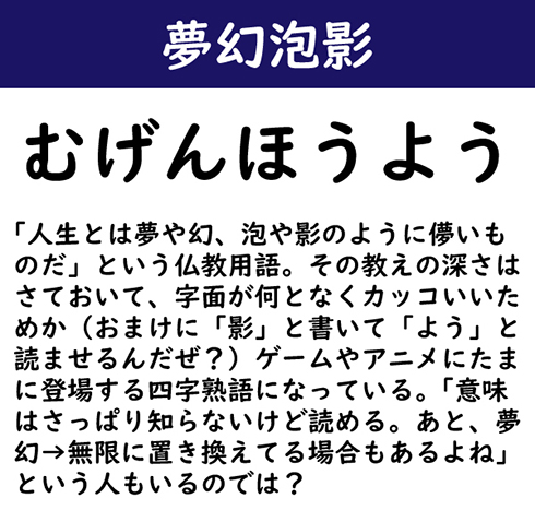 「人生とは夢や幻、泡や影のように儚いものだ」という仏教用語。その教えの深さはさておいて、字面が何となくカッコいいためか(おまけに「影」と書いて「よう」と読ませるんだぜ?)ゲームやアニメにたまに登場する四字熟語になっている。「意味はさっぱり知らないけど読める。あと、夢幻→無限に置き換えてる場合もあるよね」という人もいるのでは?