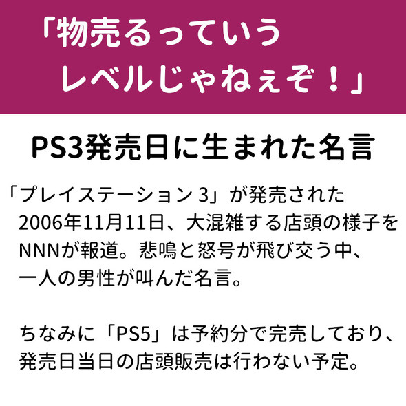 「プレイステーション 3」が発売された2006年11月11日、大混雑するビックカメラ有楽町店の様子をNNNが報道。悲鳴と怒号が飛び交う中、一人の男性が叫んだ言葉が「物売るっていうレベルじゃねぇぞ!」であり、視聴者に強烈なインパクトを残した。