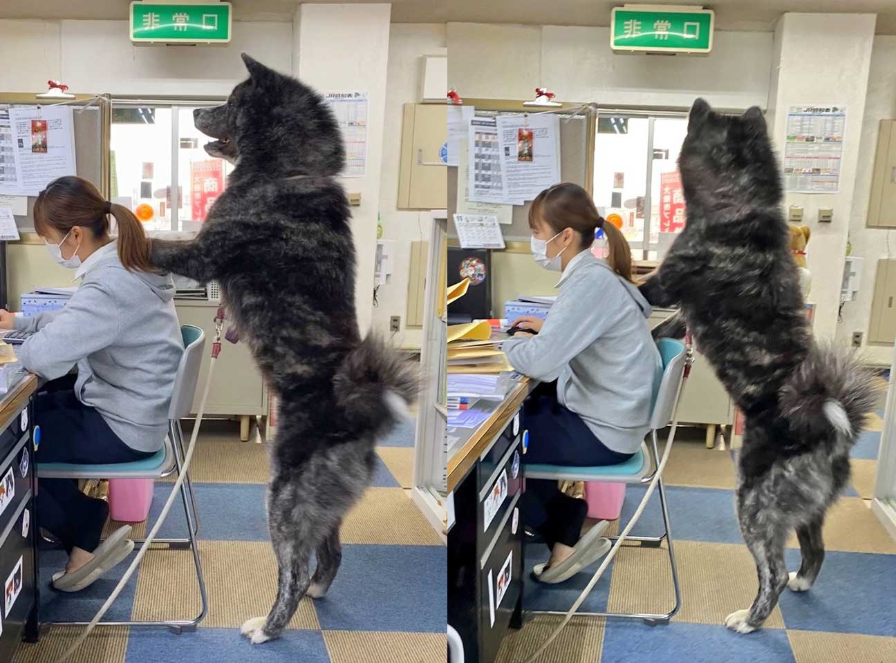 お仕事中の職員さんに前足を置いた立ち姿が、一瞬クマか着ぐるみのように見えるサイズ感の秋田犬「スバル」くん。かまって欲しいからジャマをしているのかと思いきや……?