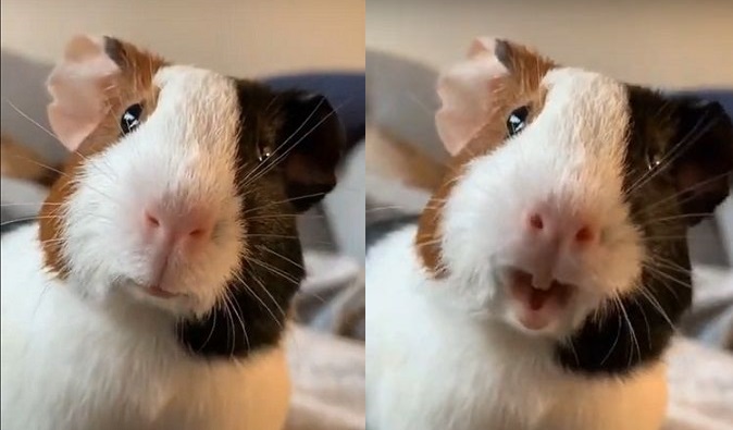 動画はモルモットの顔が正面から見える角度で撮影されており、モルモットが「キュイッキュイッ」と鳴くと口が開いて鼻が少し膨らむのが見えます。「えー!?」と驚いているようにも見える表情がとっても愛らしいですね。ときおり見える前歯や口をモグモグさせる瞬間もかわいい! 真っ黒でつぶらな瞳は見開いたままなので、モルモットに関する知識がないとどういう感情なのか判断が難しいです。
