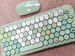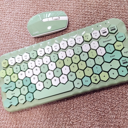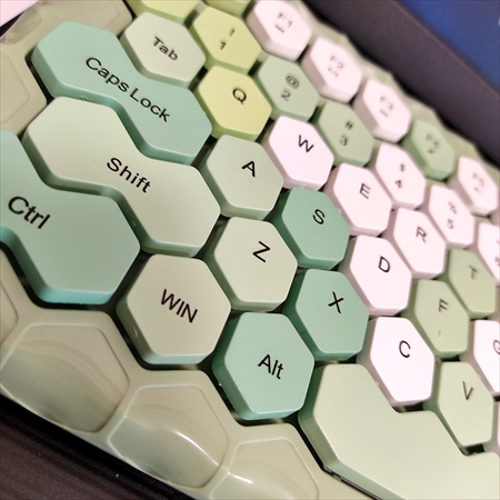 キートップは濃淡が異なるパステル調の緑色と白が入り交じっており、カラフルで見ていて楽しくなります。六角形のキートップが並んだハニカム構造もキュートです。同系色のマウスも付属しています。