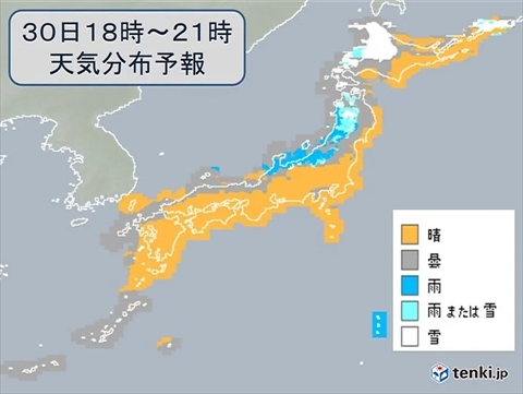 あす30日は冬型の気圧配置になるでしょう。北海道は北部や南西部で雪が降りやすい見込みです。東部は大体晴れるでしょう。東北の日本海側は雪や雨が降りそうです。東北の太平洋側も雨雲や雪雲の流れ込む所があるでしょう。北陸は断続的に雨で、カミナリを伴って雨脚の強まる所もありそうです。山陰は雲の多い天気が続くでしょう。一方、関東から九州はおおむね晴れそうです。沖縄は雲が広がりやすいでしょう。