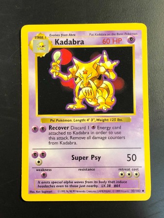 ユンゲラーは片手にスプーンを持った、サイコパワーを持つポケモン(英語名は「Kadabra」)。ユリ・ゲラーさんは20年前に、無許可で名前などをポケモンカードに使われたとして任天堂に対して訴訟を起こしました。その後、ユンゲラーはポケモンカードには登場しなくなりました。