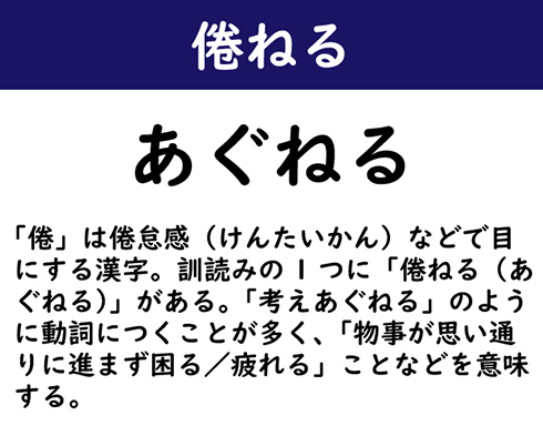 「倦」は倦怠感(けんたいかん)などで目にする漢字。訓読みの1つに「倦ねる(あぐねる)」がある。「考えあぐねる」のように動詞につくことが多く、「物事が思い通りに進まず困る/疲れる」ことなどを意味する。