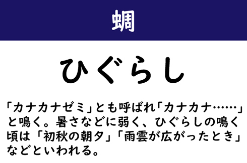 「カナカナゼミ」とも呼ばれ「カナカナ……」と鳴く。暑さなどに弱く、ひぐらしの鳴く頃は「初秋の朝夕」「雨雲が広がったとき」などといわれる。