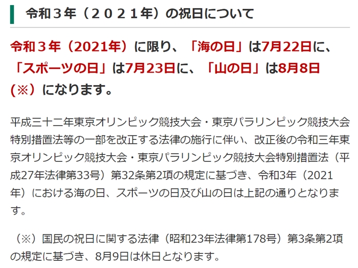 内閣府が2021年の祝日を発表しています。これによると、2021年に限り「海の日」は7月22日に、「スポーツの日」は7月23日に、「山の日」は8月8日(※8月8日は日曜日なので、8月9日が振替休日)になります。