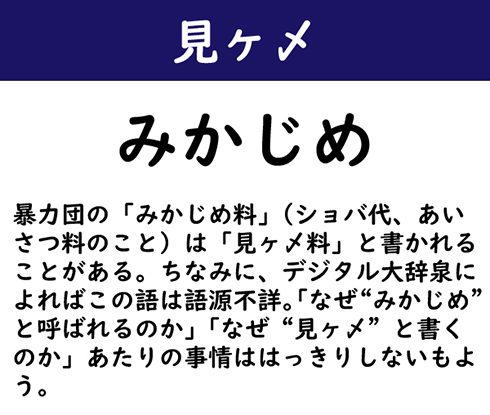 暴力団の「みかじめ料」(ショバ代、あいさつ料のこと)は「見ヶ〆料」と書かれることがある。ちなみに、デジタル大辞泉によればこの語は語源不詳。「なぜ“みかじめ”と呼ばれるのか」「なぜ“見ヶ〆”と書くのか」あたりの事情ははっきりしないもよう。
