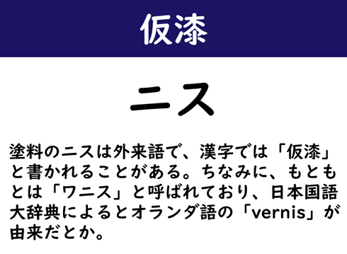 塗料のニスは外来語で、漢字では「仮漆」と書かれることがある。ちなみに、もともとは「ワニス」と呼ばれており、日本国語大辞典によるとオランダ語の「vernis」が由来だとか。