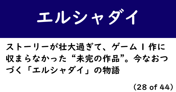 ちなみに、「エルシャダイ」ポータルサイトの情報によると、同作は「リーマンショックによりスタジオの閉鎖を余儀無くされ物語が一部未完に終わったゲームです。そのやり残した想いが『神話構想』という形で、今も紡がれています」とのこと。