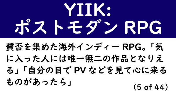年末企画「自分の好きなゲームが世間ではクソゲーと言われている人インタビュー」。今回は、世紀末1999年のアメリカを舞台にした、賛否両論のRPG「YIIK: ポストモダンRPG」(PC/PS4/Switch)。