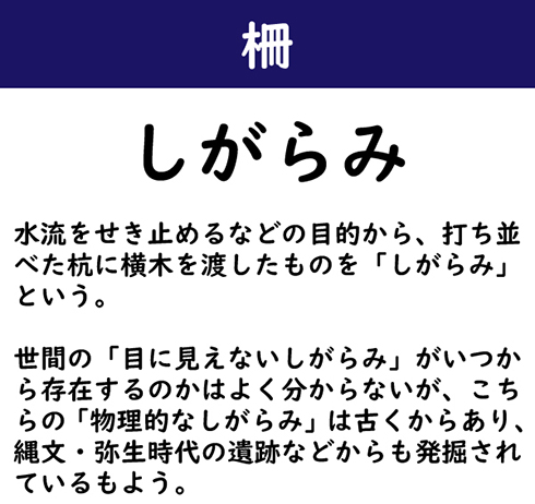 水流をせき止めるなどの目的から、打ち並べた杭に横木を渡したものを「しがらみ」という。世間の「目に見えないしがらみ」がいつから存在するのかはよく分からないが、こちらの「物理的なしがらみ」は古くからあり、縄文・弥生時代の遺跡などからも発掘されているもよう。