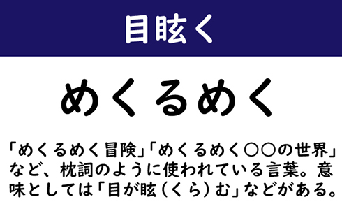 「めくるめく冒険」「めくるめく○○の世界」など、枕詞のように使われている言葉。意味としては「目が眩(くら)む」などがある。