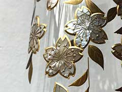 主に木の器に漆(うるし)を塗った「漆器」に施される装飾として知られる蒔絵を、シャンパングラスのようなおしゃれなガラス製のコップに施した作品。透明な背景だけに、模様がはっきりと浮かび上がり、その美しい色と輝きが目を引きます。