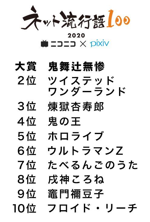 12月15日、「ネット流行語100」年間大賞2020表彰式が開催され、ネットで最も流行った単語がランキング形式で発表されました。大賞は『鬼滅の刃』より「鬼舞辻無惨」に決定。pixiv賞は「ツイステッドワンダーランド」、ニコニコ賞は「たべるんごのうた」が受賞しました。