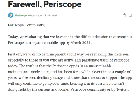 Twitter傘下のライブ動画サービス「Periscope」が2021年3月までに終了します