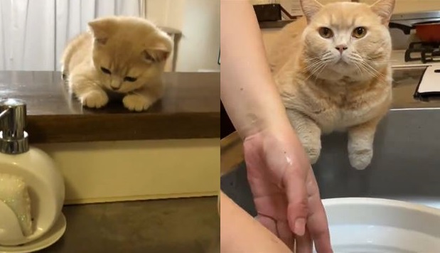 飼い主さんの手の動きや水の流れをきょろきょろと視線を動かしながら見ている様子は愛らしく、ちょこんとそろったまん丸な前足もたまらないかわいさです。飼い主さんを応援しているのかな? それとも、ちゃんと洗えているか監督しているつもりなのかもしれませんね。