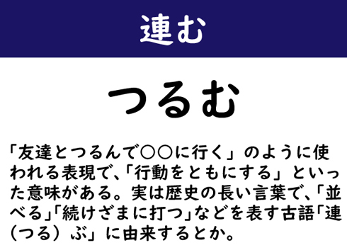 「友達とつるんで○○に行く」のように使われる表現で、「行動をともにする」といった意味がある。実は歴史の長い言葉で、「並べる」「続けざまに打つ」などを表す古語「連(つる)ぶ」に由来するとか。