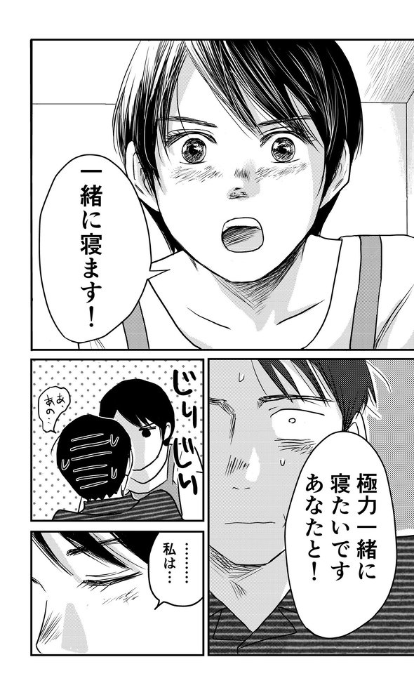 寝ぼけて枕をズタズタにしてしまった正臣は「もし隣で寝ている妻を引っ掻いていたら……」と顔面蒼白。朝食の席で「これからは別々の部屋に寝よう」と提案しますが、断固としてそれを断ります。「一緒に寝ます! 極力一緒に寝たいです!」「きっと何か方法があるはずだから」テーブルを乗り越える勢いで身を乗り出し、夫の顔を真っすぐ見つめながら。