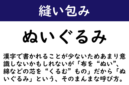 漢字で書かれることが少ないためあまり意識しないかもしれないが「布を“ぬい”、綿などの芯を“くるむ”もの」だから「ぬいぐるみ」という、そのまんまな呼び方。