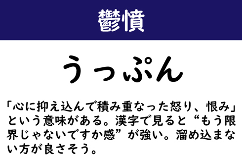 「心に抑え込んで積み重なった怒り、恨み」という意味がある。漢字で見ると“もう限界じゃないですか感”が強い。溜め込まない方が良さそう。