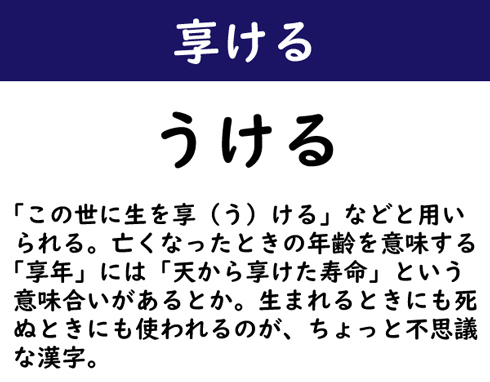 「この世に生を享(う)ける」などと用いられる。亡くなったときの年齢を意味する「享年」には「天から享けた寿命」という意味合いがあるとか。生まれるときにも死ぬときにも使われるのが、ちょっと不思議な漢字。