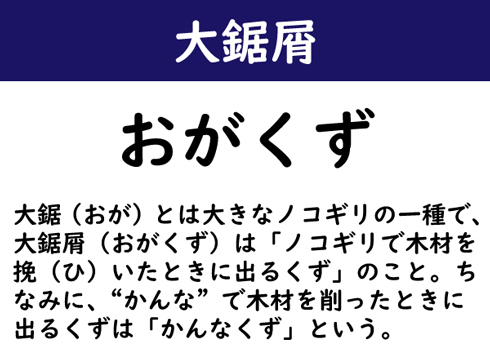 大鋸(おが)とは大きなノコギリの一種で、大鋸屑(おがくず)は「ノコギリで木材を挽(ひ)いたときに出るくず」のこと。ちなみに、“かんな”で木材を削ったときに出るくずは「かんなくず」という。