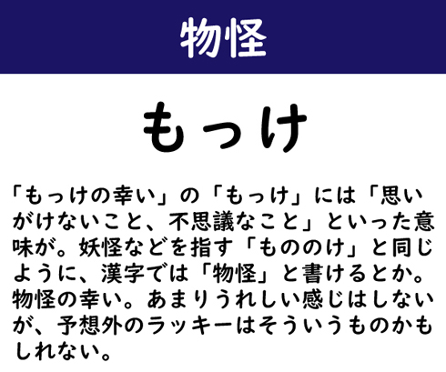 「もっけの幸い」の「もっけ」には「思いがけないこと、不思議なこと」といった意味が。妖怪などを指す「もののけ」と同じように、漢字では「物怪」と書けるとか。物怪の幸い。うれしい感じはしないが、あまりにも予想外のラッキーは、そういうものかもしれない。