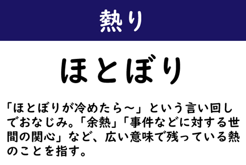 「ほとぼりが冷めたら〜」という言い回しでおなじみ。「余熱」「事件などに対する世間の関心」など、広い意味で残っている熱のことを指す。
