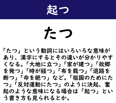 「たつ」という動詞にはいろいろな意味があり、漢字にするとその違いが分かりやすくなる。「大地に立つ」「家が建つ」「故郷を発つ」「時が経つ」「布を裁つ」「退路を断つ」「命を絶つ」など。「祖国のためにたつ」「反対運動にたつ」のように決起、奮起のような意味になる場合は「起つ」という書き方も見られるとか。